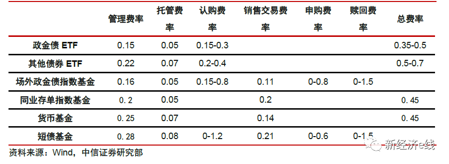 此外,通过对比场外政金债指数基金、其他债券ETF、货币基金、同业存单指数基金和短债基金的费率之后发现,政金债ETF在费率方面具有较大优势。