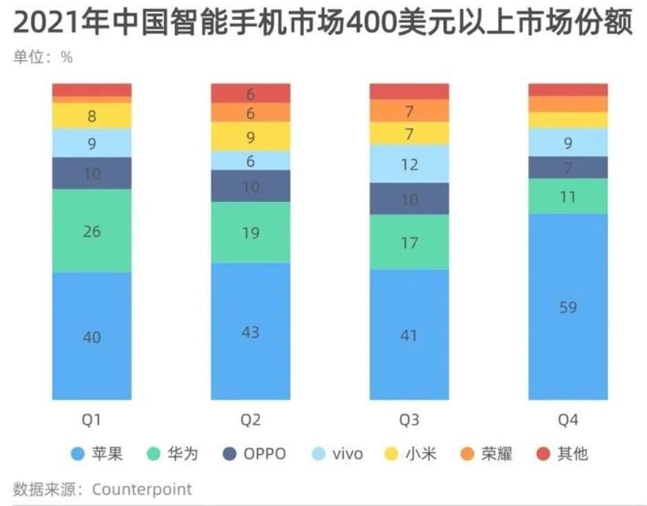 Counterpoint数据显示,2021年四季度,中国批发价在400美元以上高端智能手机中,苹果以近六成的市占率取得第一,华为虽然货源不足,但仍以11%的份额位列第二。而其他四家手机厂商间相差不大,vivo与OPPO分别以9%和7%排名三、四,小米与荣耀均以5%并列第五。