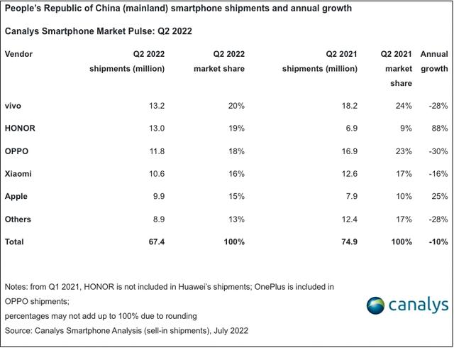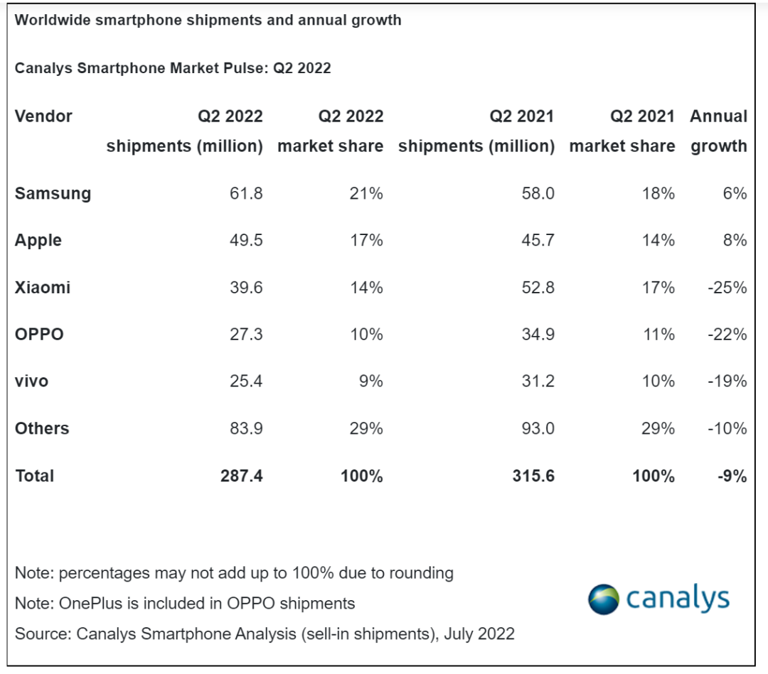 Canalys数据显示,2022年第二季度全球智能手机出货量降至2.87亿部,这是自2020年第二季度疫情首次爆发以来的最低数字。