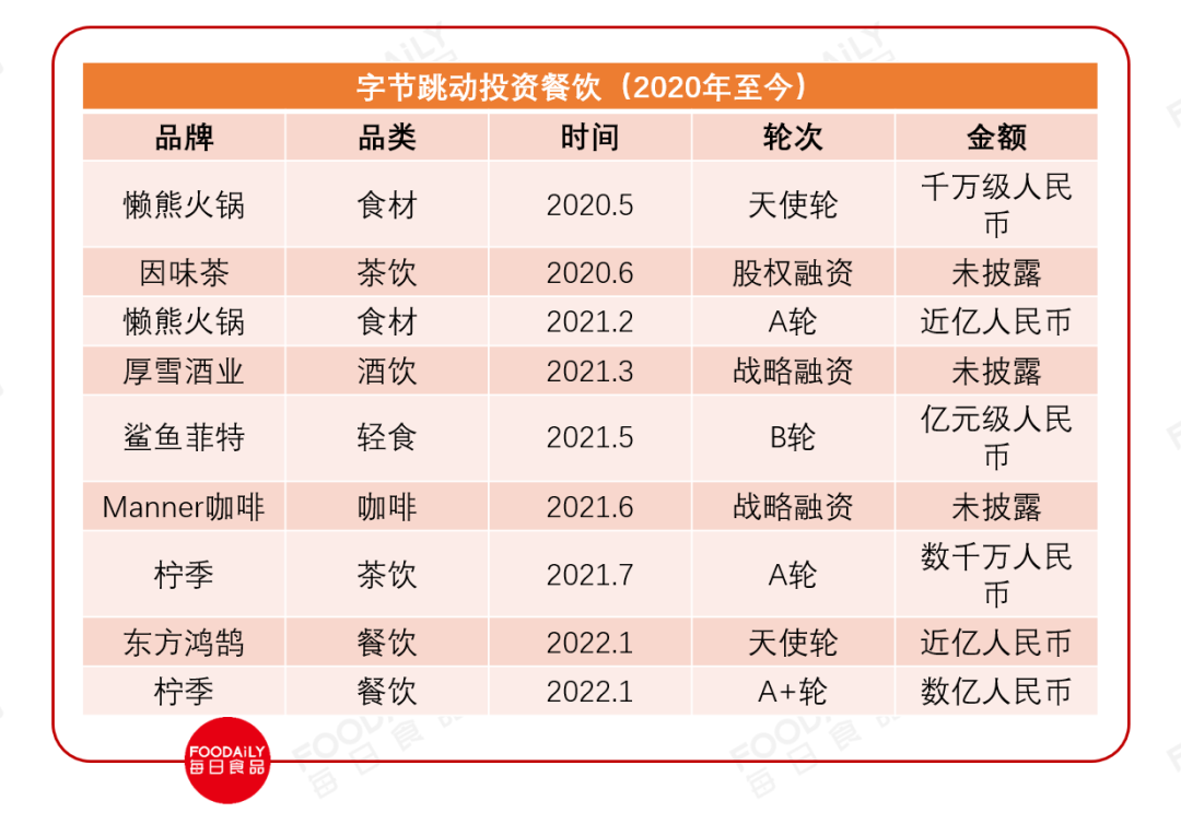 细数字节跳动所有投融资情况可以看到,自2020年至今,字节一共出手了多次,其中9次与餐饮相关。