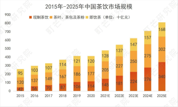 根据町芒研究院发布的《2022现制茶饮行业研究报告》,目前我国现制茶饮市场规模已达千亿,近年实现高速增长,市场占比由2015年的16.4%增长到了2020年的27.7%。2021年全国现制茶饮门店数量已突破500,000家,全国市场年消费金额已超过1400亿元。预计到2025年,中国现制茶饮市场规模将达到3400亿元。