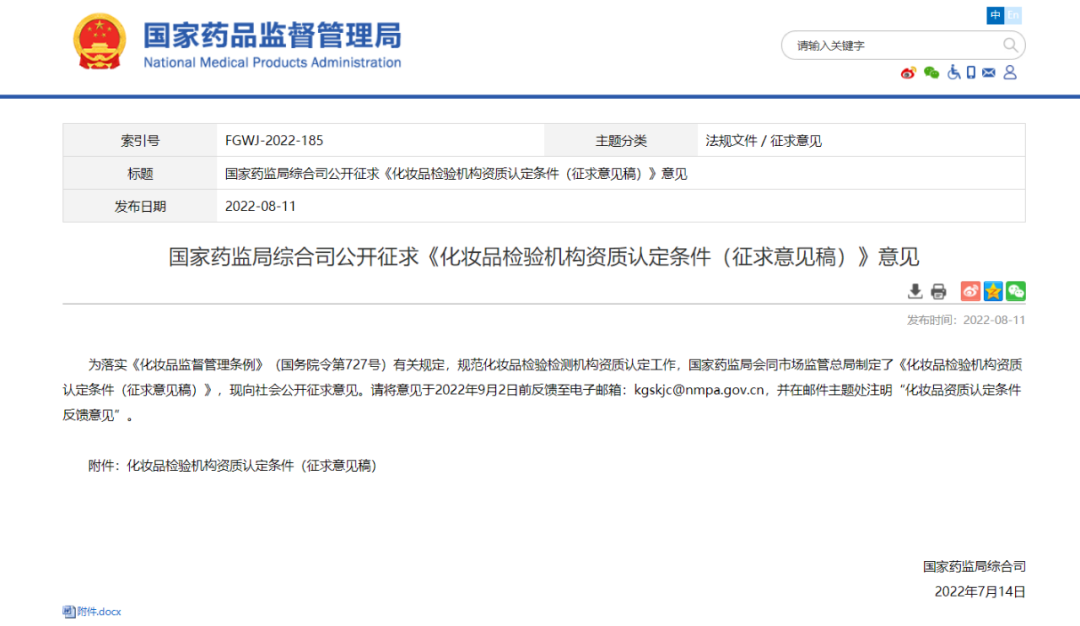 8月11日,国家药监局综合司发布了公开征求《化妆品检验机构资质认定条件(征求意见稿)》(下称意见稿)的通知。