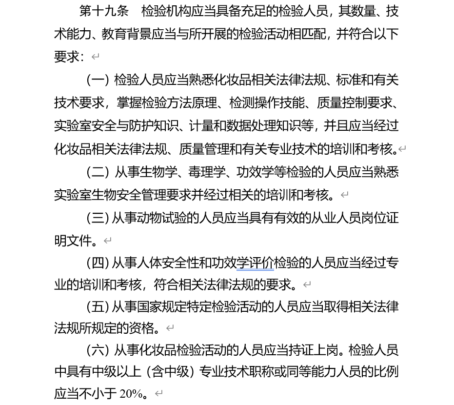 而要成为检验人员,则必须满足6个基本条件,包括通过化妆品相关法规、专业技术、质量管理、实验室生物安全管理要求等培训和考核,也就是说,从事化妆品检验活动的人员应当持证上岗,且检验人员中具有中级以上(含中级)专业技术职称或同等能力人员的比例应当不小于20%。