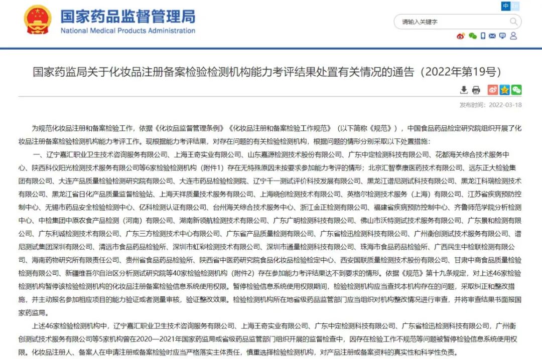 3月,国家药监局发布关于化妆品注册备案检验检测机构能力考评结果处置有关情况的通告显示,46家检测机构被暂停化妆品注册备案检验信息系统使用权限、12家机构被要求进行整改,共58家化妆品检测机构都未通过评定。