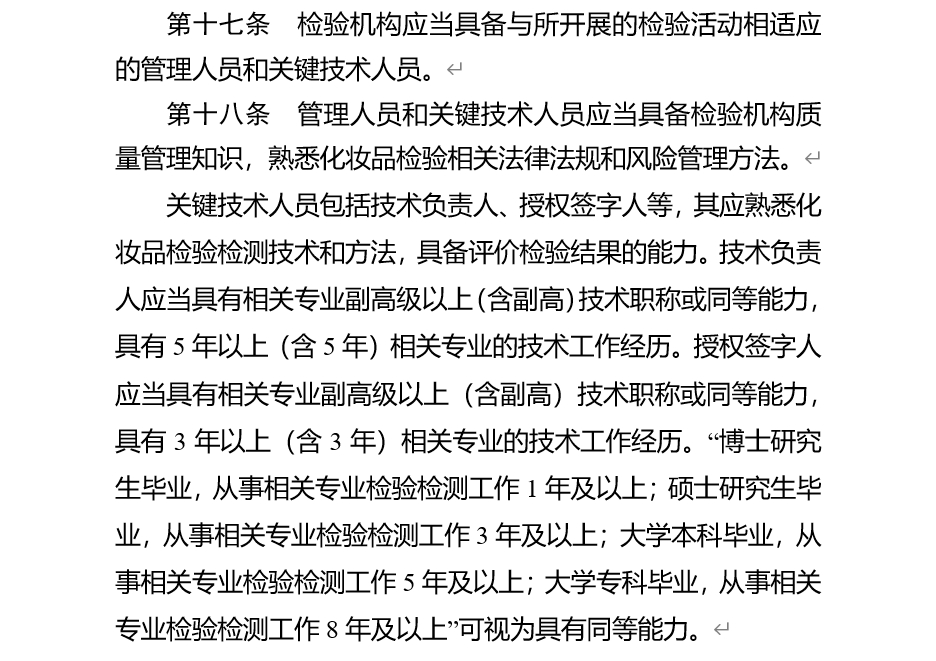 具体而言,关键技术人员包括技术负责人、授权签字人等,应当具有相关专业副高级以上(含副高)技术职称或同等能力,分别需满足5年以上(含5年)、3年以上(含3年)相关专业的技术工作经历。针对一些特殊情况,《意见稿》也放宽了标准,博士研究生、硕士研究生、大学本科、大学专科生只要满足相关工作年限,“可视为具有同等能力”。