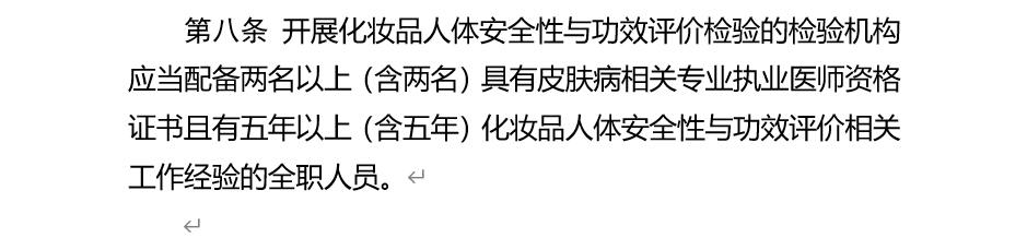 意见稿第八条还指出,开展化妆品人体安全性与功效评价检验的检验机构应当配备两名以上(含两名)具有皮肤病相关专业执业医师资格证书且有五年以上(含五年)化妆品人体安全性与功效评价相关工作经验的全职人员。