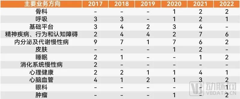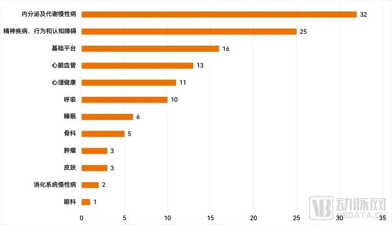 按这些融资企业的主要业务而言,最受关注的前三位分别是内分泌及代谢慢性病、精神疾病、行为和认知障碍,以及数字疗法平台服务。