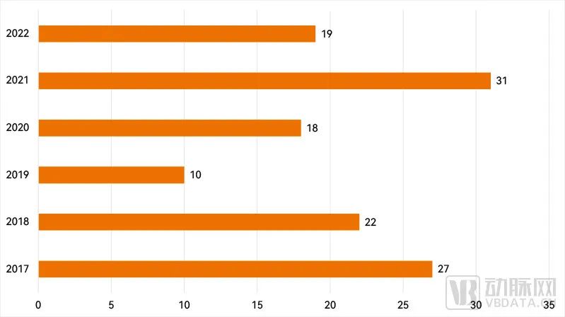 虽然2018年以22起投融资事件暂时排在第三,但仅比2022年多3起。考虑到2022年还有接近半年的时间结束,2022年全年超越2018年的投融资水平应该不是什么难事。