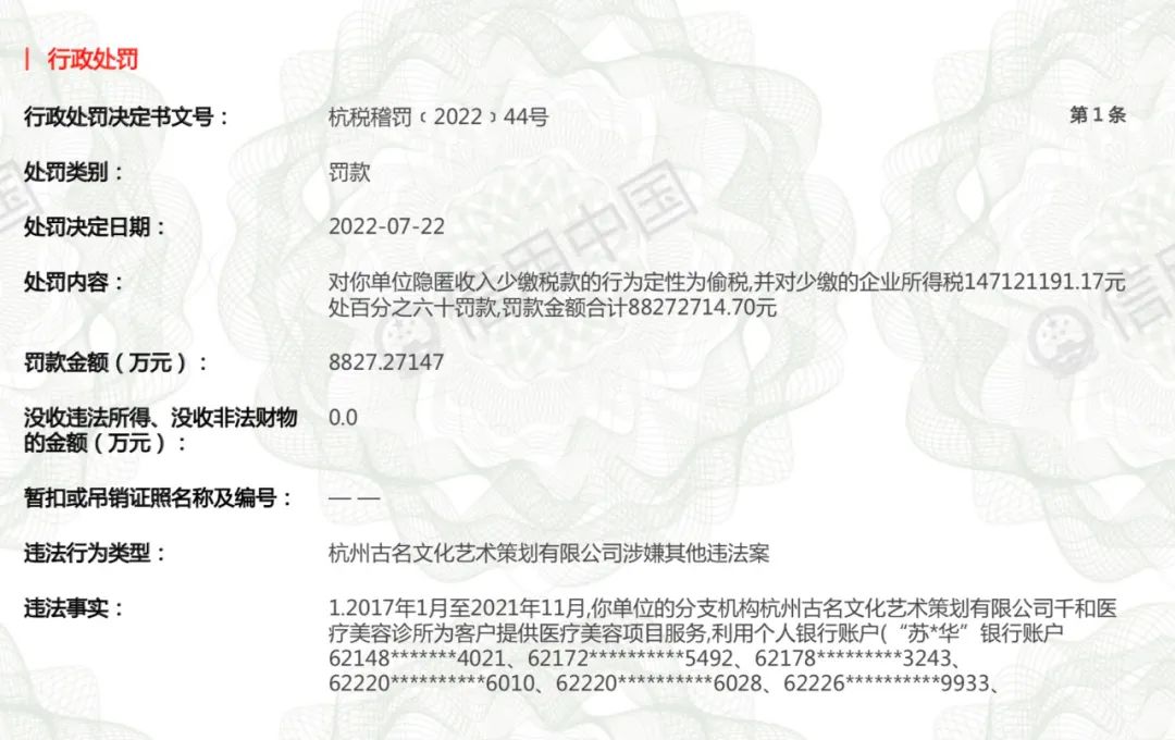 此次,该公司违法事实主要有两点:一是隐匿收入。2017年1月至2021年11月,其分支机构杭州古名文化艺术策划有限公司千和医疗美容诊所为客户提供医疗美容项目服务,利用九个个人银行账户收取服务款并隐匿收入。上述账户收到款项(含税收入)约53.44亿元,扣减保证金和已作收入申报等事项的金额5.89亿元后,共计隐匿服务收入47.55亿元。