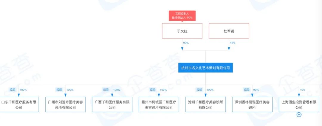 逃税事件后,该公司“背后大佬”也浮出水面。企查查股权穿透书显示,杭州古名文化还在山东、广州、广西、深圳、上海、沈阳等多地投资控股了医疗美容公司,且该公司大股东为虞美人国际集团实控人于文红,持股比例90%。