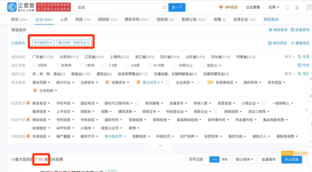 化妆品观察搜索企查查发现,截至目前,已有7150家存续、在业的医美相关企业被行政处罚,涉及的违法行为包括不限于未取得《医疗机构许可证》擅自开展医疗美容服务、无资格人员开展医疗美容服务、诊疗活动超出登记范围、偷税逃税等。