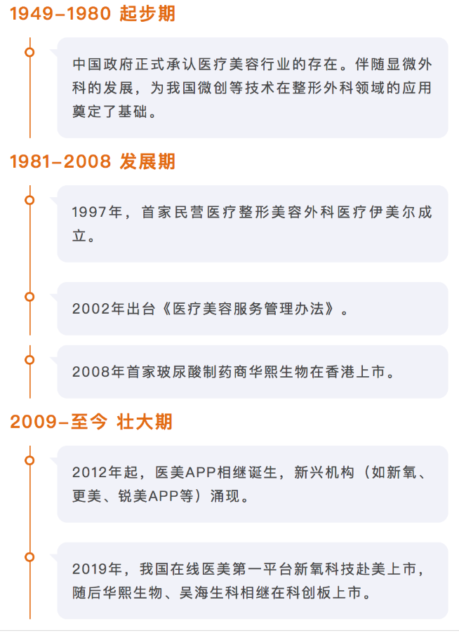 从20世纪50年代至今,我国医美已经历了70年的发展。在2010年后,伴随着新氧科技赴美上市、华熙生物、昊海生科在科创板上市,我国医美行业呈现爆发式增长。