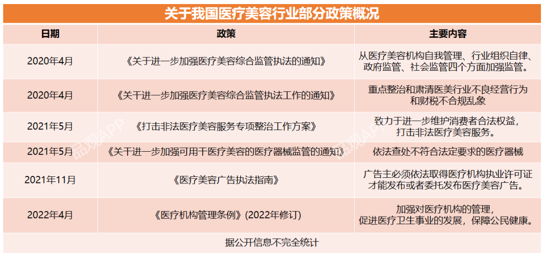 此外,2021年至今,国家相关部门已出台了4部政策或要求,从打击非法医疗美容、管理医疗美容广告、医疗机构管理等方面对医疗美容行业进行全面监管。