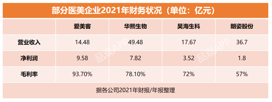 以“医美三剑客”爱美客、华熙生物、昊海生科和近几年在医美领域动作频频的朗姿股份为例,2021年,上述四家企业的净利润分别为9.58亿元、7.82亿元、3.52亿元和1.8亿元。此外,上述企业的毛利率均超过50%,最高毛利率达93.7%。