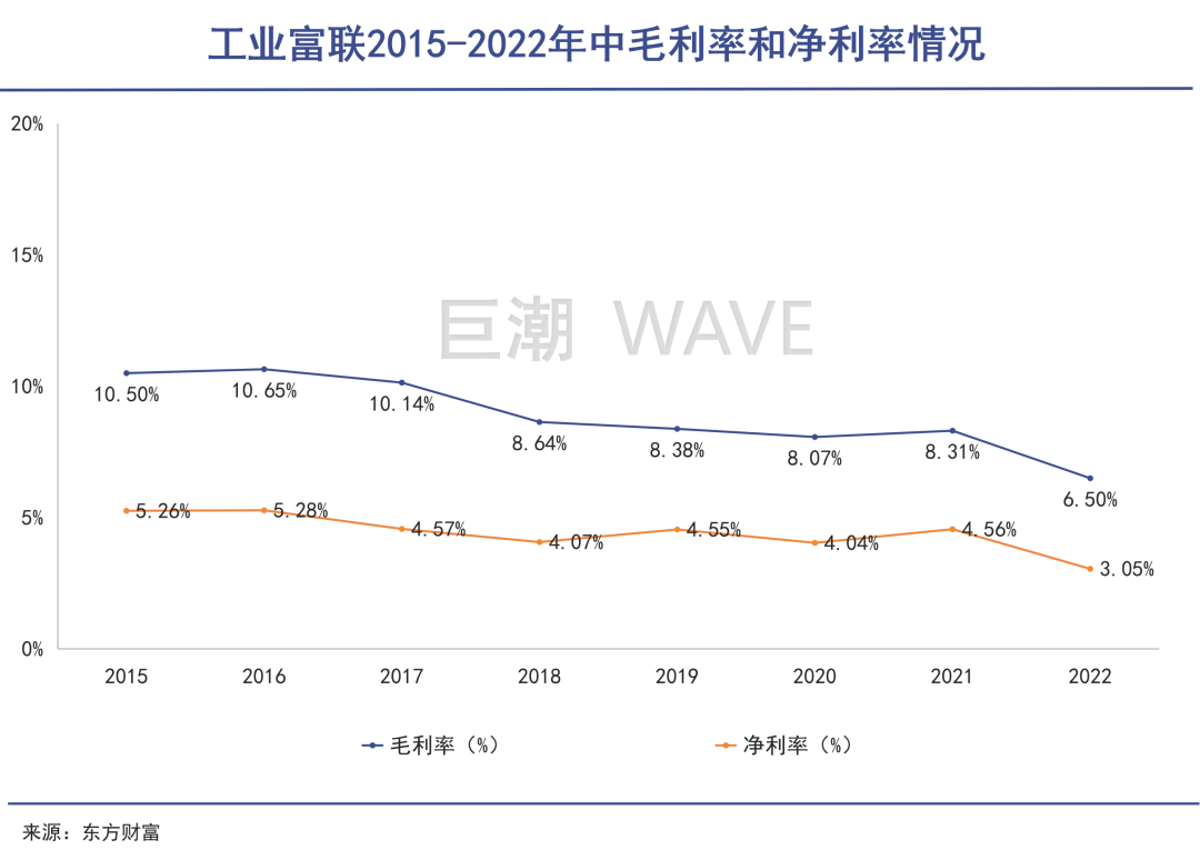 2018年至2021年,工业富联的毛利率分别只有8.64%、8.38%、8.07%、8.31%,净利率分别为4.07%、4.55%、4.04%、4.56%,普遍低于上市之前的2015年至2017年。