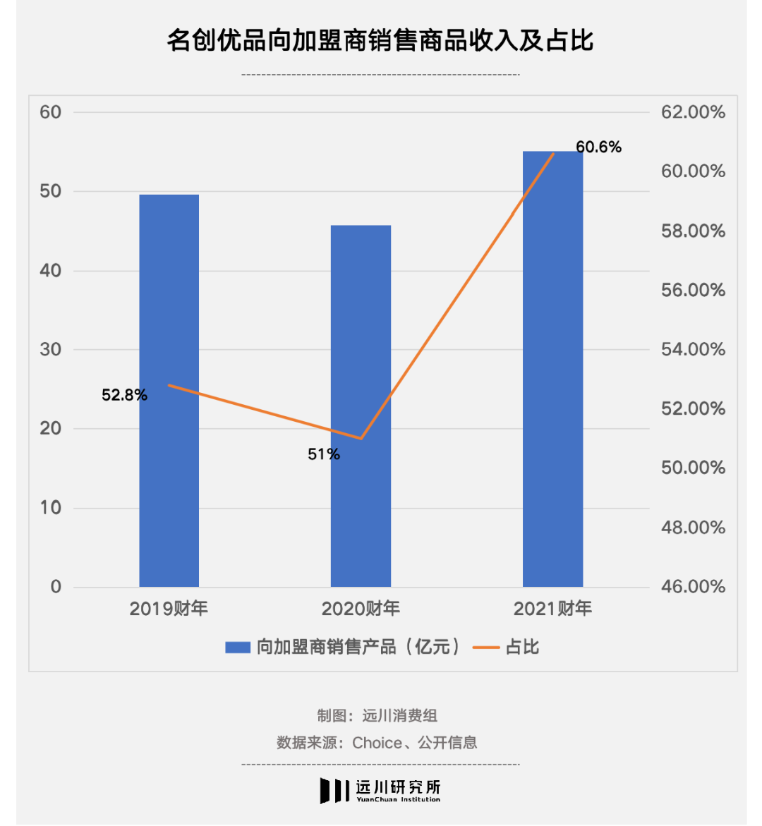 毕竟在名创优品的收入构成中,占比最大的一项为“向加盟商销售产品”,过去三年,该项目占比均超过营收的一半以上,在2021财年达到60.6%。
