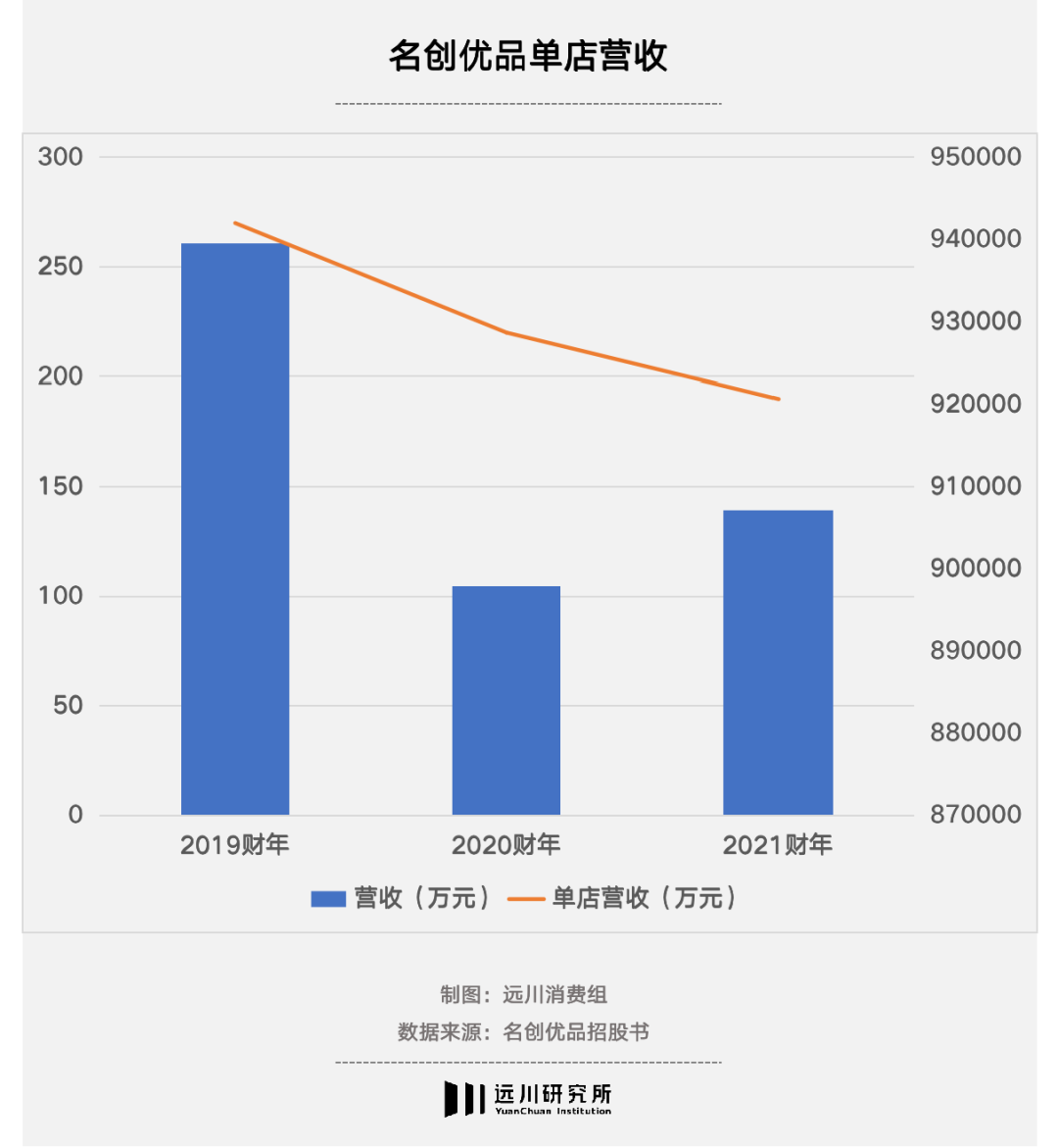 但在2020-2021财年,名创优品的单店收入分别同比下降19.8%和11.3%,这意味着加盟商每月拿到手里的真金白银是切实地变少了。