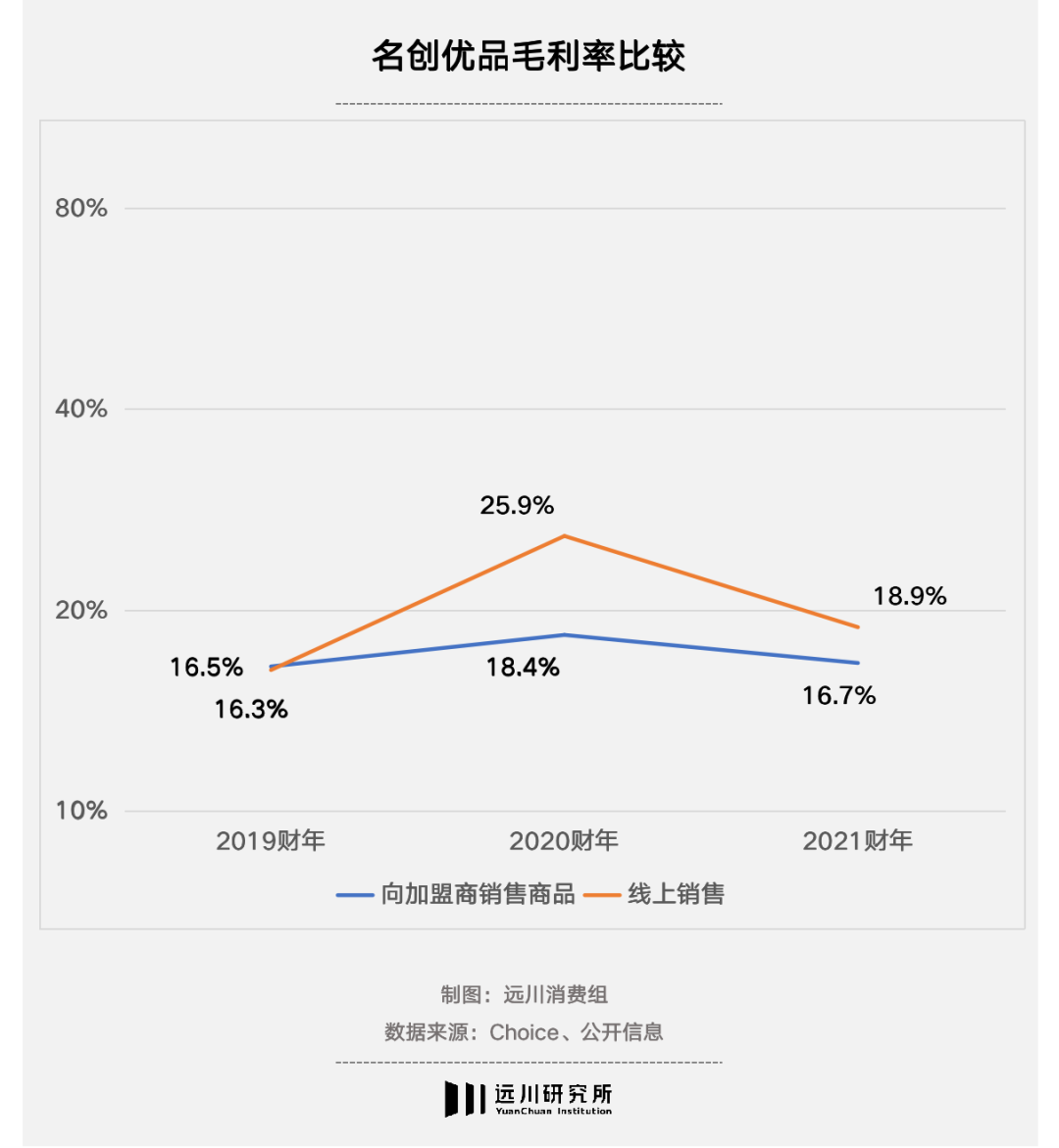这一趋势愈演愈烈的2021财年,名创优品线上销售额已经约占总销售额的10%。毛利率方面,线上销售也实现了对线下加盟商的反超,2021财年达到18.9%;去年下半年更进一步达到22.3%,比线下加盟商渠道高4.5个百分点。