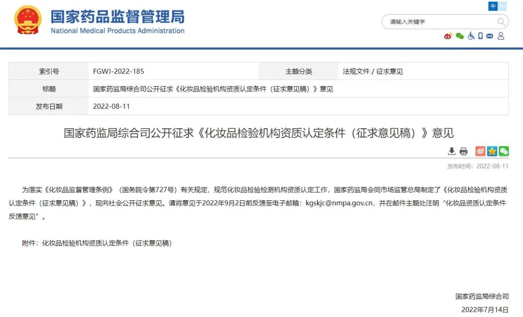 8月11日,国家药品监督管理局发布《化妆品检验机构资质认定条件(征求意见稿)》(以下简称“《认定条件》”),向社会公开征求意见。反馈截止日期为2022年9月2日,市场反馈时间仅22天。