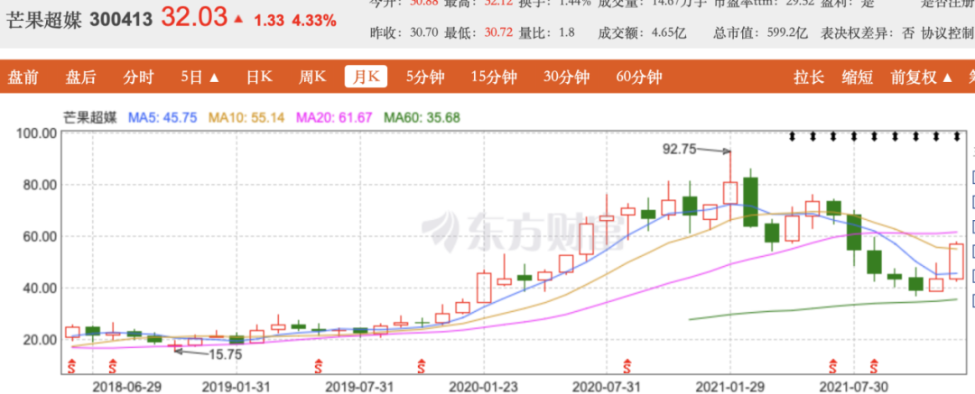 凭借强硬的业绩表现,芒果超媒在资本市场也曾表现强势,股价自2018年6月底的不足22元/股,一度涨至2021年1月的92.75元/股,翻了400%有余,市值也超过1700亿元,成为A股市值最高的国有文化传媒公司。