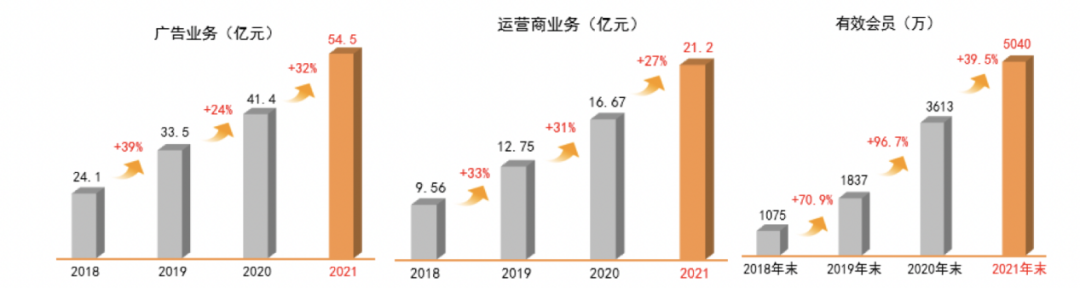 根据其2021年年报数据显示:广告业务营收首次突破50亿元达到54.53亿元,同比增长31.75%,占芒果超媒全年营收的35.5%;会员业务营收达到36.88亿元,同比增长13.3%,占芒果超媒全年营收的24.02%,其中会员用户数达到5040万,较2020年末增长39.5%;运营商业务收入21.2亿元,同比增长27.17%,占芒果超媒全年营收的13.81%。