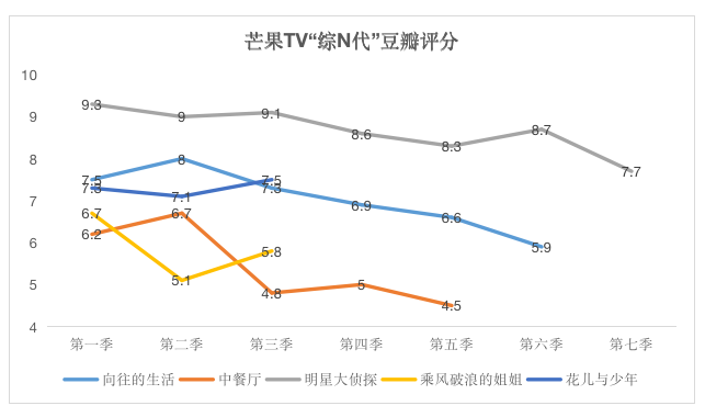 如《向往的生活》已经播到了第六季,在节目内容及环节难以创新的情况下,其豆瓣评分从第一季的7.5分降至第六季的5.9分,其他如《乘风破浪的姐姐》、《花儿与少年》等节目也是一路走低。