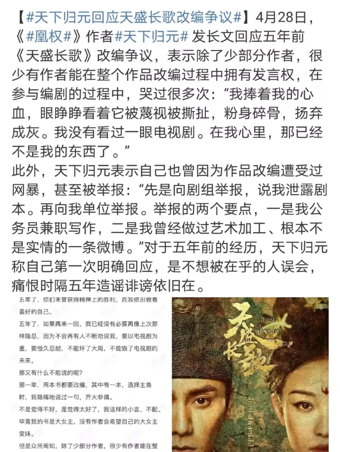 今年四月,《天盛长歌》原著作者发长文回忆当年遭遇:原著大女主作品被迫改为大男主。演员粉向剧组举报作者泄露剧本,但作者当时早已离组。之后粉丝又向单位举报作者身为公务员兼职写作,同时还造谣、辱骂其家人,组团到豆瓣给原著打低分。