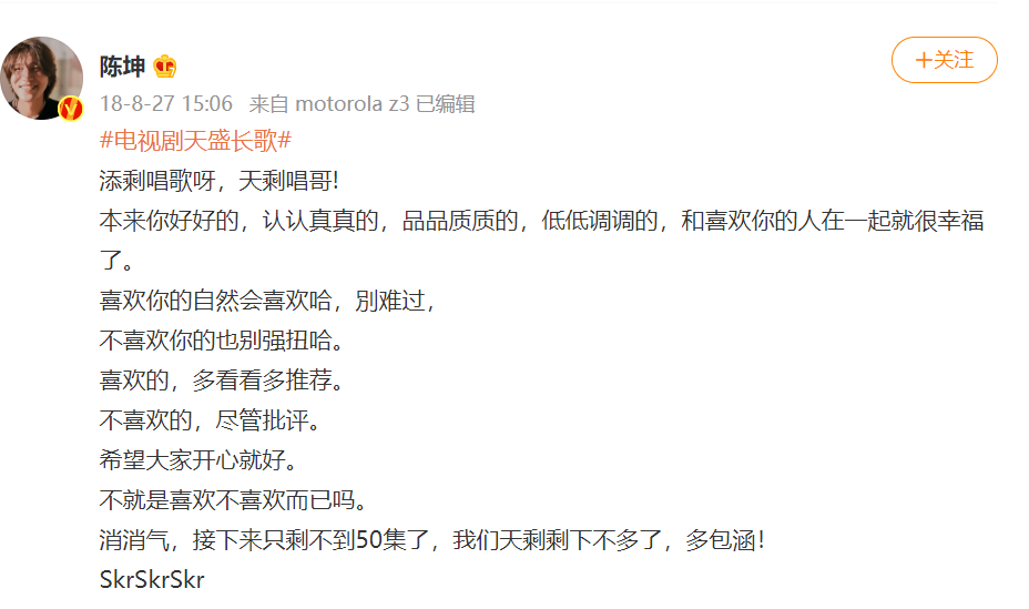 在粉丝的言论中,陈坤来演三流网文小说是屈尊降贵。这种公开甩锅平台和原著的行为,惹恼了一众网友。