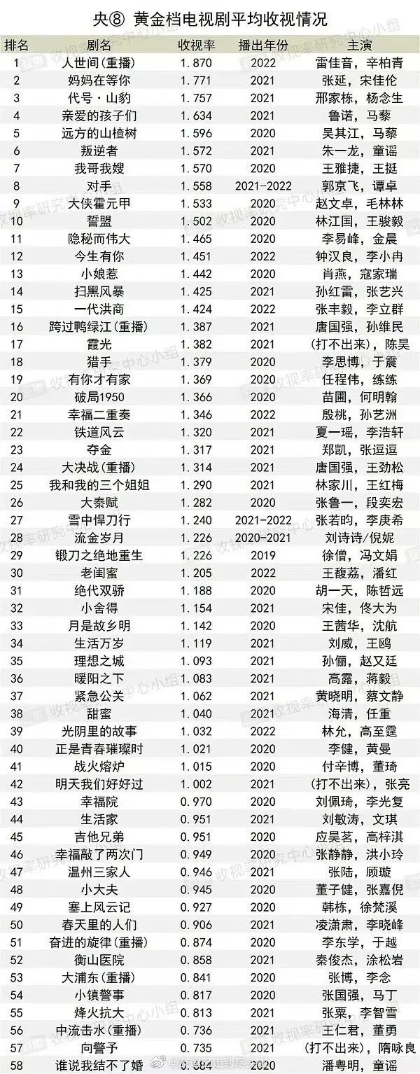 央八黄金档平均收视率(2020-2022)数据来源:豆瓣@收视率研究中心,微博@友谊已走到尽头