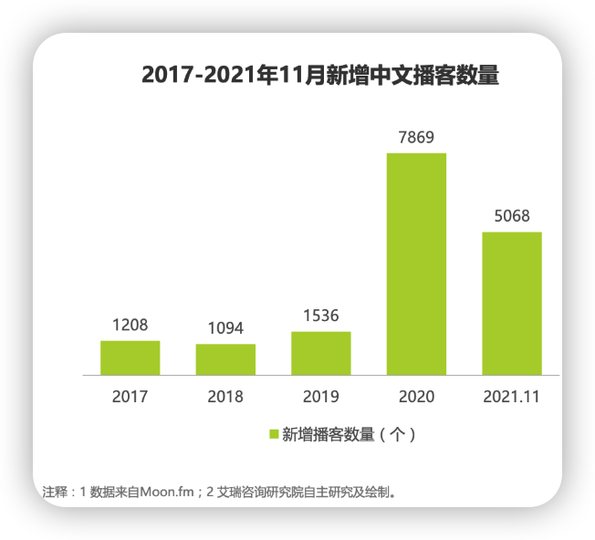 艾瑞咨询2021发布的《中国网络音频产业报告》显示,中文播客数量2020年新增7869个,总数量达到16448个。2021年又再新增5068个中文播客。