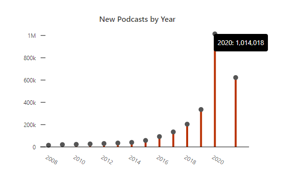 不仅是中国,在世界范围内,播客数量在疫情元年2020年都出现井喷式增长: