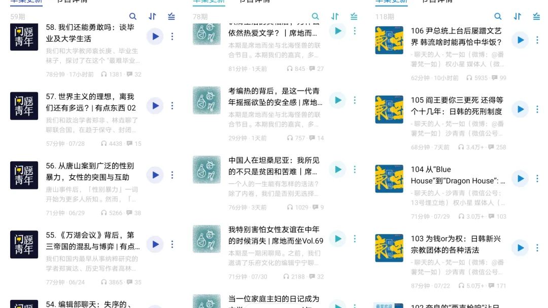播客的陪伴感,与音乐、电视声音所带来的陪伴又不太一样。音乐和电视声音是真正的、纯粹的背景音,可以完全不需要听者的参与,而听播客的时候,由于是就某个主题进行的谈话,听者一般仍会分一些注意力于内容上,参与度更高。有一定的参与度,更容易有所收获,便不会觉得自己只是为了听而听,为了打发时间而跟风听播客。