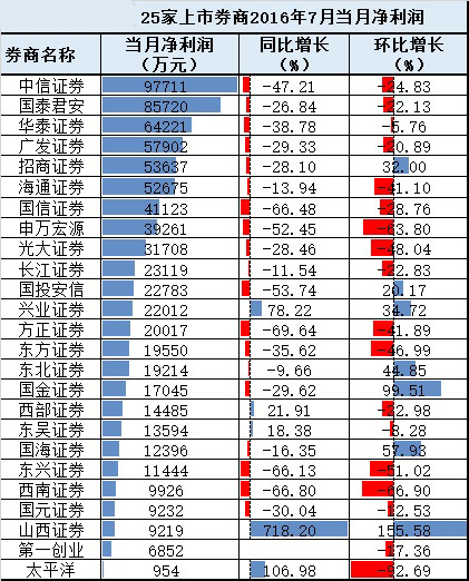 25家上市券商7月份营业收入总计175亿元,环比下降15.60%;净利润75.58亿元,较上个月下降26.44%。只有7家券商净利润环比增长,大部分券商业绩环比下滑。