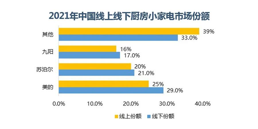 因为社交和网络的营销方式的特殊性,小家电的市场销售份额,通常会从线上和线下两个层面来看,因为各大品牌的侧重点是有所不同的,有的占据线下实体店,有的主攻网络电商,而小厨电这块呢,我们从下图里可以看到,2021年线上线下零售额份额,排名前三的分别是美的、苏泊尔和九阳,这三大巨头凭借线下渠道、产业链优势,发力品类创新,并在社交电商上开始发力,所以他们的线上线下销售情况也是齐头并进的。