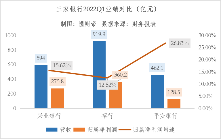 2022Q1,兴业银行营收为594亿元,约等于0.65个招行。归属净利润为275.8亿元,约等于0.77个招行。