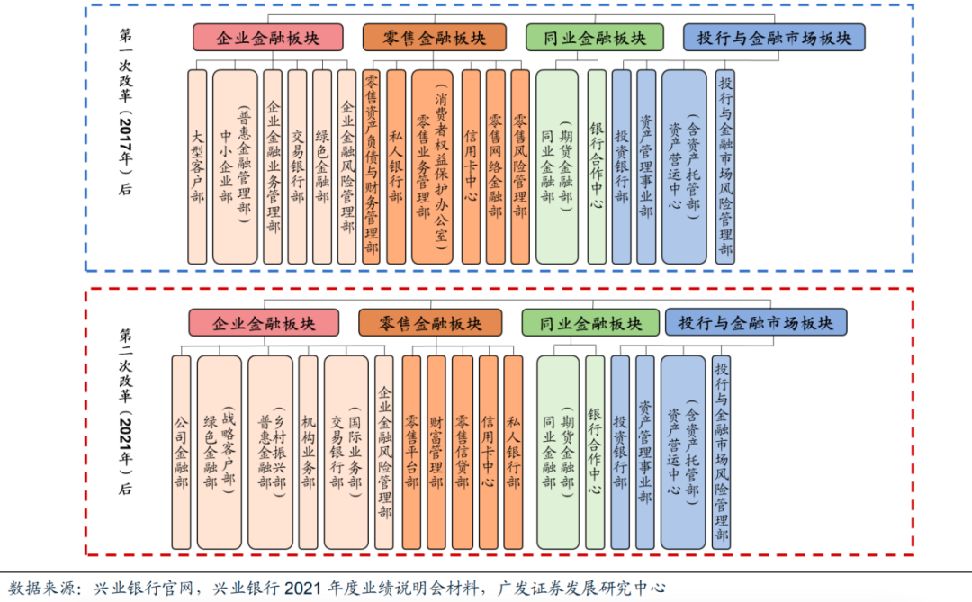 为了从重资本模式转型轻资本模式,兴业银行于2017年提出了“商行+投行”核心战略体系,并于当年进行了系统性组织架构调整。