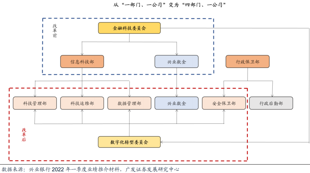 其中在科技条线,兴业银行设立了数字化转型委员会、科技管理部、数据管理部、科技运维部、安全保卫部,与兴业数金形成“一委员会、四部门、一公司”架构,希望建立起数字化经营与风控体系。