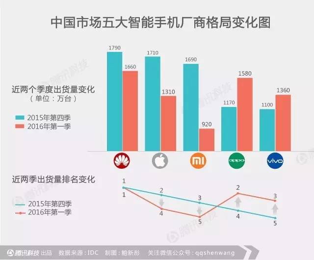 更为严峻的是,小米手机的销量已经被对手甩在身后。IDC数据报告显示,2015年第四季度中国智能手机市场排名华为第一,苹果第二,小米已经落到了第三。2016年第一季度华为依然排名第一,第二至第四名分别为OPPO、vivo和苹果,小米已经落到第五。2016年第二季度,OPPO和vivo则再度超越小米。