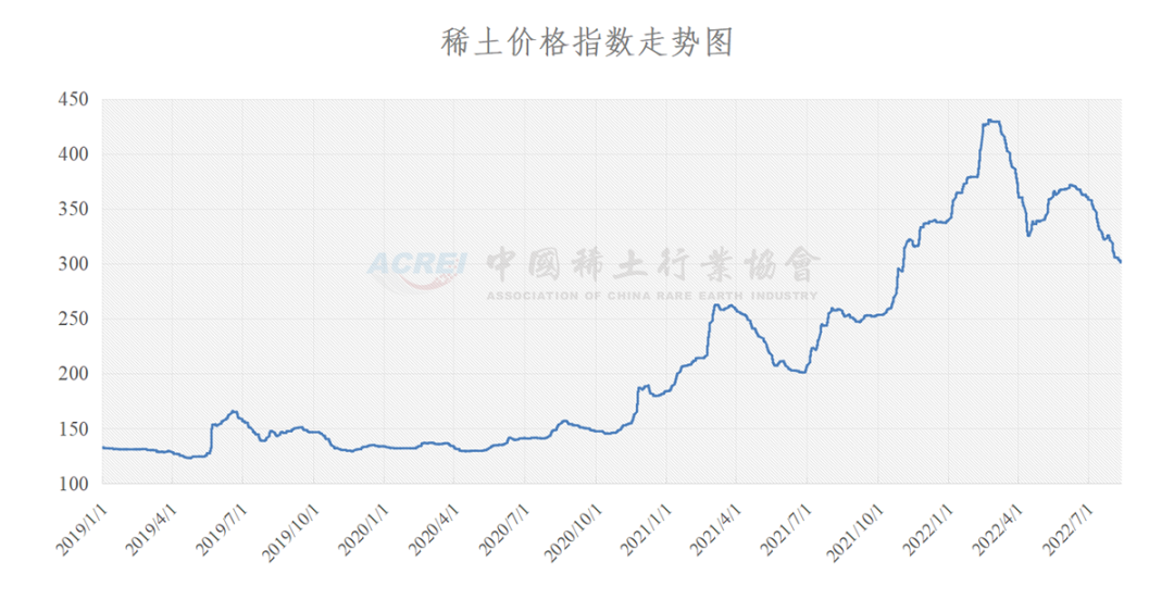 据中国稀土行业协会,2022年8月15日稀土价格指数为300.0,较上周五下跌1.1点。