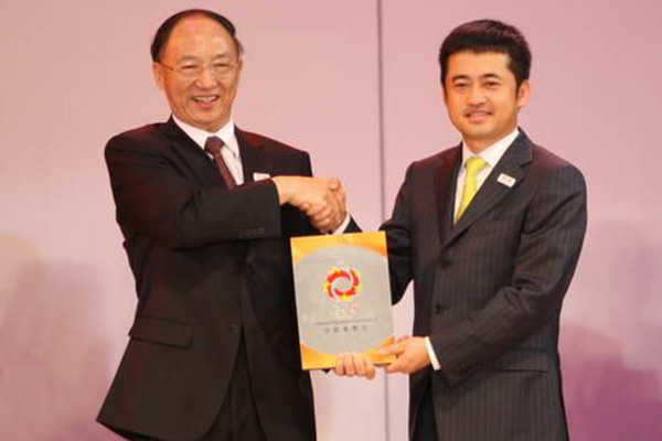 ▲图:安踏成为2009—2012年中国奥委会合作伙伴。国家体育总局局长、中国奥委会主席刘鹏(左)将一面特制的中国奥委会会徽交予丁世忠(右),作为此次合作的永久纪念。