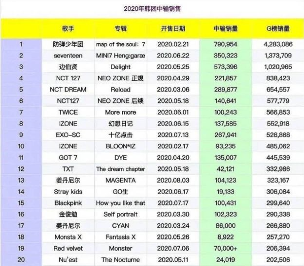 2020年中输排名第二及第三的,则是Pledis娱乐旗下男团SEVENTEEN的mini7以及SM旗下男团EXO成员边伯贤的个人solo专辑。其中,边伯贤专辑的中输占到了专辑总销量的一半。