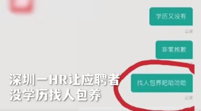 比如,深圳一位HR在网上公开他与应聘者的聊天内容,称对方没学历,去找人包养。此事引起众多网友的不满,据说此HR还是该公司高管。