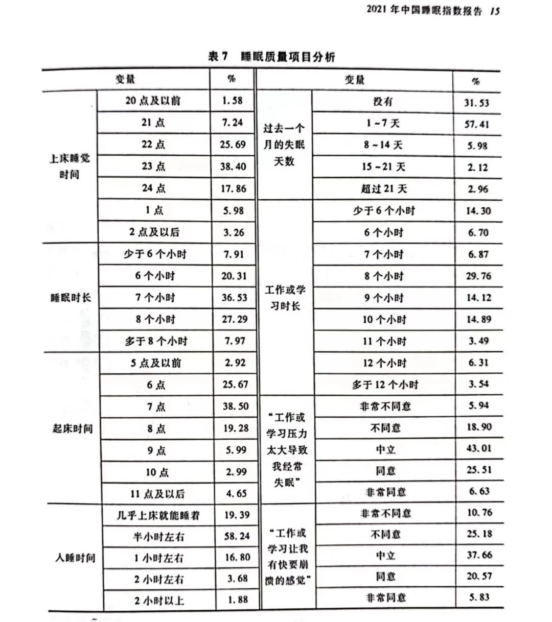 据中国社会科学院社会研究学所联合喜临门睡眠研究院主编、社会科学文献出版社出版的《中国睡眠研究报告(2022)》(以下简称“《报告》”)数据显示,民众每天平均睡眠时长为7.06小时,64.75%的民众每天实际睡眠时长不足8个小时,超过8个小时的被调查这比例仅为7.97%。而在职场人士中,超六成的被调查者每晚实际睡眠时间不足8小时。