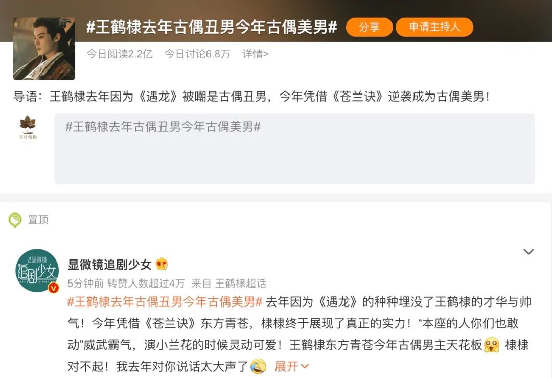 一方面,古偶几乎做到了逢播必火。以8月15日某时段的微博热搜为例,Top20里相继上榜了#王鹤棣去年古偶丑男今年古偶美男#、#杨紫回应颜淡吃醋#、#赵露思帮吴磊擦汗# 3个热门话题,而他们正好对应的就是《苍兰诀》《沉香如屑》《星汉灿烂·月升沧海》3部热播古偶剧。