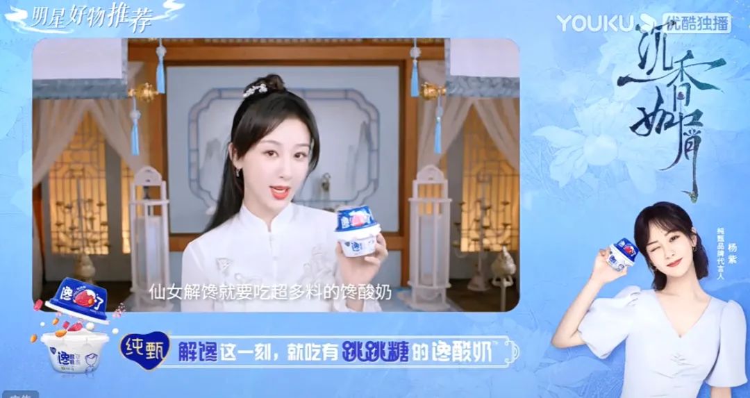 不同于过往的“强打断”,《沉香如屑》剧末出现的“明星好物推荐小剧场”是以彩蛋形式放出,不会打扰观众酝酿观后情绪。“大家好,我是仙界导游颜淡”,让杨紫以打破第四堵墙的“仙界导游”身份安利产品,广告情绪与剧集情绪一脉相承,一句“仙女解馋就要吃超多料的馋酸奶”的广告语精准打到杨紫粉丝受众,带货效果不言而喻。