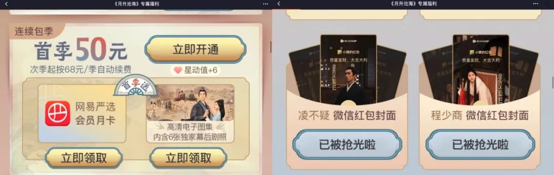 《星汉灿烂·月升沧海》则开辟了专门的品牌营销通道。平台在该剧播放界面右下方放置了一个“解锁独家花絮”的按钮,观众可以点击进入领取“特惠开会员”福利,平台售出会员同时就可连带着绑定销售网易严选月卡、凌不疑程少商同款的微信红包封面,把“有钱大家一起赚”的原则奉行到底。