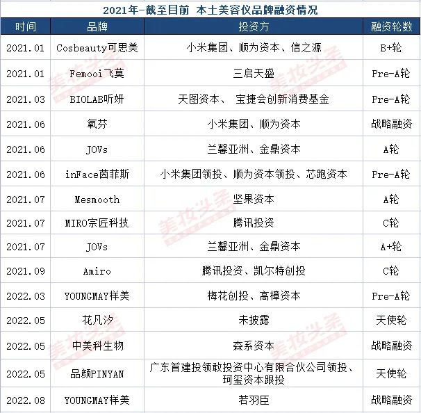 随着家用美容仪市场成为又一个突破百亿的蓝海,其商业潜力也开始受到了主流资本的关注,包括小米、华为、腾讯、真格基金、顺为资本、IDG资本、深创投、坚果资本、珂玺资本、首建投等知名企业以及机构都相继入局美容仪赛道,投融资额高至数亿元。