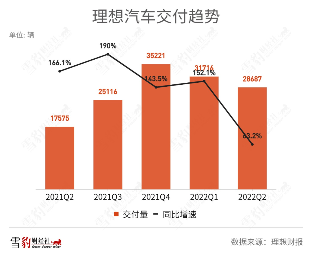 据财报,Q3交付量预计为2.7万~2.9万辆,同比增长7.5%~15.5%,低于市场给出的3.9万辆的预期。交付量的降低,直接导致理想对Q3营收增长的预期降至20%上下。以往,理想给出的交付量增速预测,鲜有低于三位数——即使在受疫情影响严重的Q2,其交付量仍同比增长超60%。