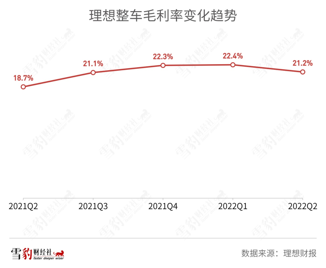 同样下降的还有理想一直引以为傲的毛利率。理想以控制成本见长,毛利率在新势力中一直居首,但Q2毛利率在近5个季度首次出现环比下降,与上季度比下降1.2个百分点。