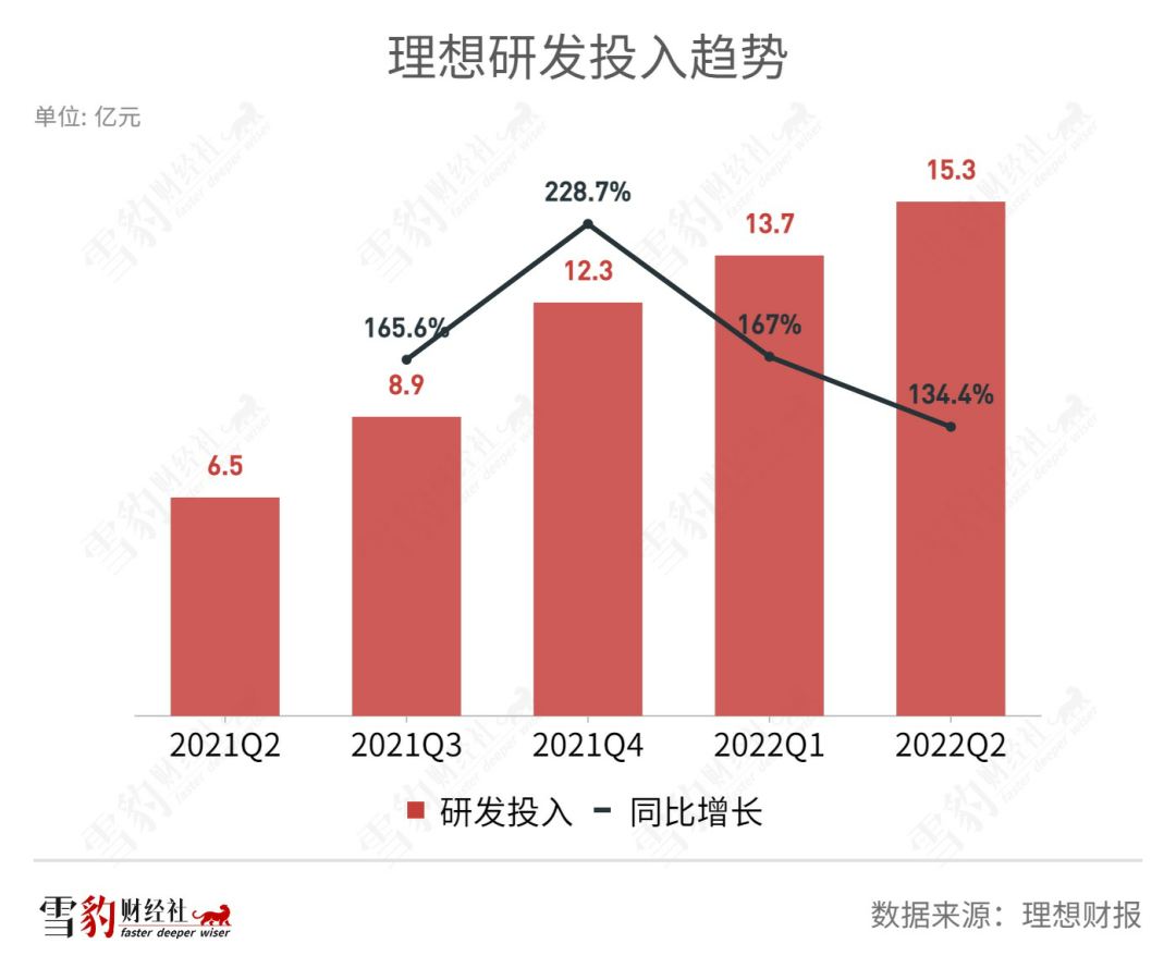 据财报,理想二季度营业费用28.6亿元,同比增长91.9%,其中研发投入同比增长134.4%至15.3亿元。相比之下,营收同比增速仅为73.3%。